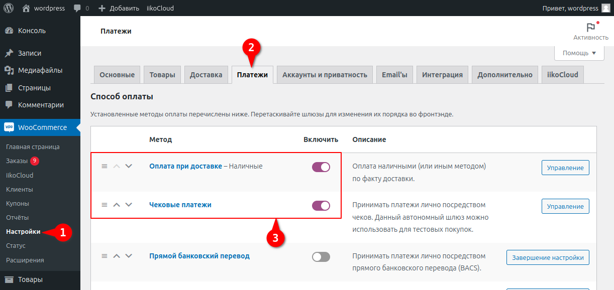 Пример: на сайте действует три метода оплаты WooCommerce - Наличные, Картой по терминалу, Картой онлайн.