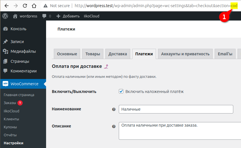 Например, настройки стандартного способа оплатыНаличныедоступны по адресу:/wp-admin/admin.php?page=wc-settings&tab=checkout§ion=cod