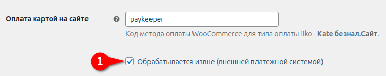 Для методов оплаты WooCommerce, использующих оплату картой на сайте (плагины интернет-эквайринга), необходимо отметить опциюОбрабатывается извне (внешней платежной системой):