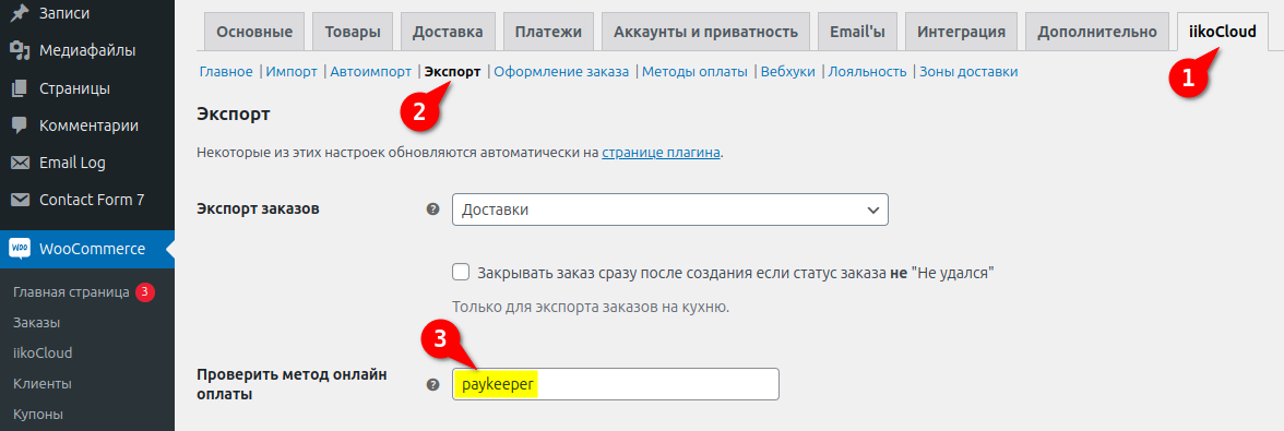 Рекомендуется также указать код метода онлайн оплаты WooCommerce, в настройках плагина во вкладкеЭкспорт. Это позволит осуществить успешность онлайн-оплаты картой перед экспортом заказа в iiko: