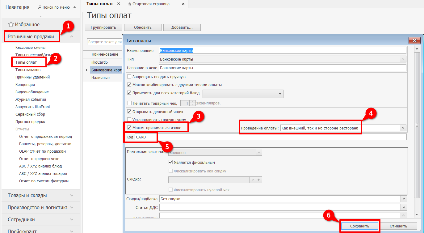 Для каждого метода оплаты используемого на сайте, должен быть создан соответствующий тип оплаты в iiko.Office в разделе Розничные продажи -> Типы оплаты.