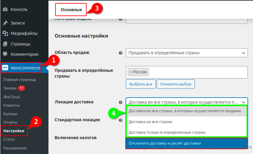 Для этого перейдите в основные настройкиWooCommerce -> Настройки -> Основные -> Локации доставки.