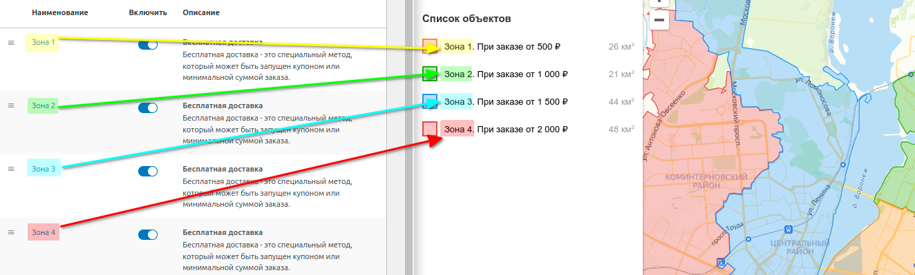 Добавьте столько методов доставки на сайте, сколько будет зон доставки на вашей карте.ПОДСКАЗКА