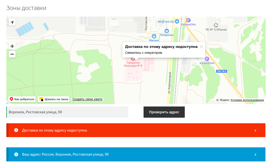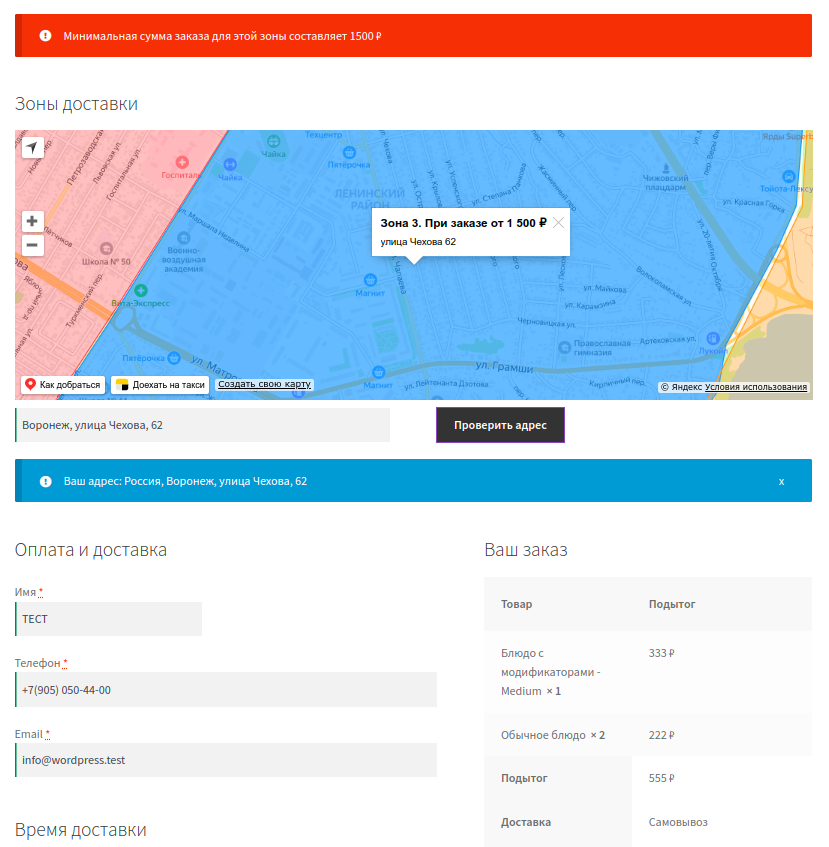 На странице оформления заказа отобразится Яндекс.Карта с зонами и полем ввода адреса под ней.